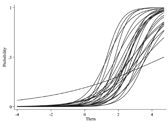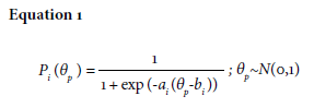Furthermore, following the model presented in Equation 1, a two-parameter IRT model was fitted to the data (Embretson & Reise, 2013; Lord et al., 1968). In the model, θp represents the latent score (i.e., mental health problems-symptoms) of each childp, which is standardized (i.e., mean of zero and standard deviation of 1). Additionally, αi. represents the discrimination parameter, which indicates how well an item can distinguish between children with slightly different levels of the latent variable, and it is similar to factor loadings in a confirmatory factor analysis where items are continuous. Particularly, the discrimination parameter shows that a 1 unit increase in the latent variable 9 produces an a increase in the log of the odds of answering the item affirmatively. Finally, bi represents item location, which shows the level of the latent variable θ at which children have even odds of answering each item affirmatively. An advantage that IRT has over CTT is that the former estimates parameters that are invariant to populations of items and individuals, whereas the latter produces population-dependent parameters (Embretson & Reise, 2013; Traub & Rowley, 1991).