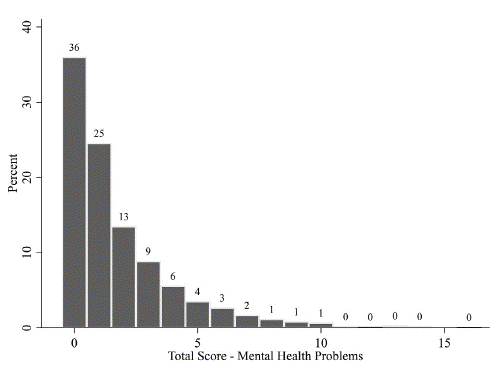 The Kaiser-Meyer-Olkin of .81 shows that the sample is adequate for conducting factor analysis (Kaiser, 1974). A factor model was fit to determine whether a 1-factor solution could represent the data. As shown in Figure 1, the first factor explained 76 percent of the total variance, suggesting that the mental health scale used in the ENSM is capturing a single underlying dimension (i.e., mental health problems). As shown in Figure 2, a summary score following a single factor solution provides a skewed scale, as was expected, given the low prevalence of the different items assessed and given the purpose of the measurement (i.e., to identify mental health problems).