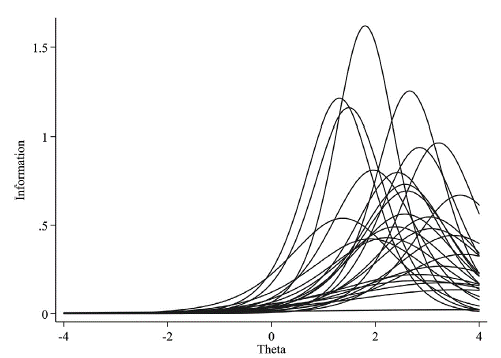 After fitting the IRT model to the data, the test information function is estimated as the sum of all item's information functions, which are calculated through their discrimination parameters (α), and the product of the likelihoods of having an affirmative (p) or negative (Q) answer in the item (Equation 2).