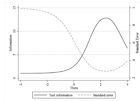 Using the test information function, the conditional errors of measurement (SE) were computed as presented in Equation 3. Contrary to CTT, where there is a single standard error of measurement for the scale, the (SE) in IRT shows the estimated error at different locations of the scale, making it possible to assess the level of imprecision in the measurement at different levels of θ.