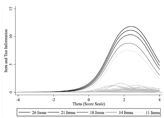 IRT'S main assumption is local independence, which indicates that theta (i.e., the level of the latent trait) provides all the information needed to know the probability of an affirmative response to an item. Given this assumption, it is possible to estimate the information provided by different scales by adding or subtracting the corresponding item information functions (Jessen et al., 2018). Figure 5 presents the test information functions for scales composed of all the 26 items, 21 items, 18 items, 14 items, and 11 items, subtracting items with lower levels of information in a stepwise fashion (see Table A2 for additional details). The reduction of items produces lower levels of information, but the reduction is not considerable. In general, even using the 11 most informing items would produce a reliable measure for high levels of theta (particularly around 2 to 3 SD above the mean).