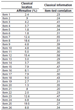To begin with, Classical Test Theory (CTT) statistics were estimated (Crocker & Algina, 1986; Novick, 1966; Traub & Rowley, 1991). To analyze the characteristics of each item, the percentage of affirmative answers was used as a classical item location estimate and the item-test correlation as a classical information estimate. For the overall scale, Cronbach's alpha was estimated to examine the reliability (i.e., internal consistency) of the scale. Subsequently, factor analysis was used to fit a unidimensional model to the data and assess the dimensionality of the scale by analyzing the share of variance accounted for by the first factor (Merino-Soto, López-Fernández & Grimaldo-Muchotrigo, 2019; Thompson, 2004).