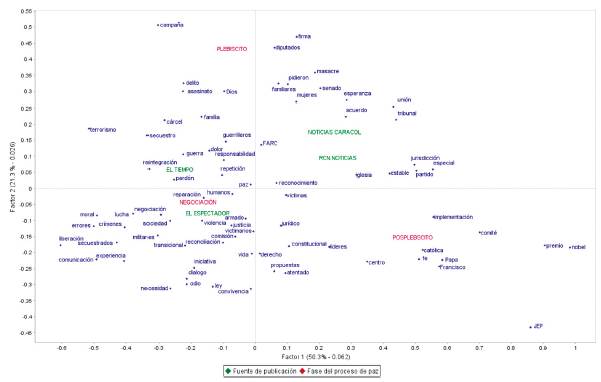 En el plano factorial (Figura 1) se presentan las 77 palabras con sentido semántico más contributivas en los encuadres mediáticos del perdón y la reconciliación. El plano representa las palabras características según la fuente de comunicación y según fase del proceso de paz, ilustrando la contraposición entre las distintas modalidades.