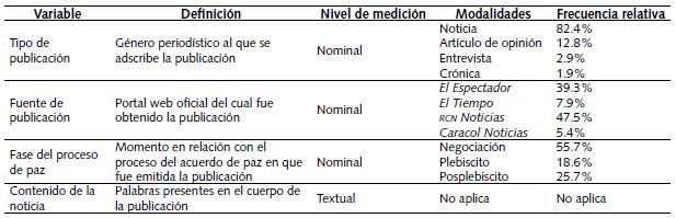 Específicamente, fueron analizadas 522 publicaciones que incluyeron las palabras perdón y reconciliación en su contenido. Estas fueron clasificadas según la palabra clave con la que aparecían en los resultados de búsqueda (reconciliación o perdón), el tipo de publicación (noticia, artículo de opinión, entrevista, crónica), la fuente (El Tiempo, El Espectador, Noticias Caracol o RON Noticias), y el momento de publicación (negociación, plebiscito, posplebiscito). De estas, las variables categóricas analizadas fueron (a) la fuente y (b) el momento de publicación. Como variables textuales fueron analizadas todas las palabras que conformaban las publicaciones (Tabla 1).