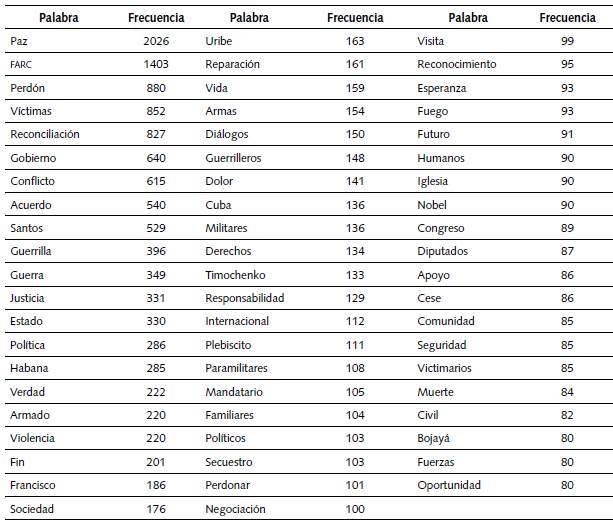 Las publicaciones incluidas ofrecían al menos una mención de las palabras perdón o reconciliación, y fueron publicadas entre 2012 y 2017. Este periodo corresponde a la fase de diálogos de paz entre el Gobierno colombiano y la guerrilla de las FARC-EP, a la refrendación del acuerdo de paz a través de un plebiscito en 2016, y a la implementación temprana del acuerdo de paz.
