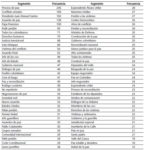 La Tabla 2 presenta las palabras más utilizadas y la Tabla 3 presenta los segmentos con mayor frecuencia de aparición en el corpus textual de los cuatro medios de comunicación considerados. Tanto las palabras como los segmentos están organizados en orden descendente según su frecuencia de aparición en el corpus textual.