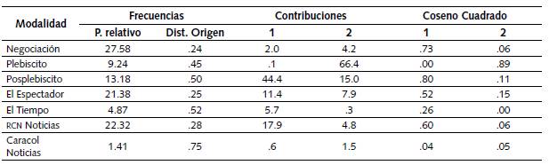 En el contexto multidimensional, se empleó el análisis factorial de correspondencias múltiples. Este análisis permite visualizar, en un espacio bidimensional, asociaciones entre variables textuales y categóricas con base matemática en el álgebra matricial (Iliev, Dehghani & Sagi, 2015). En este estudio el análisis factorial de correspondencias múltiples confirmó la agrupación de los datos en dos ejes factoriales que, según las coordenadas, evidencian la contraposición de las modalidades del discurso. En cuanto a la relevancia de las modalidades para la construcción de los factores, las modalidades negociación y posplebiscito presentan una mayor contribución al factor 1, mientras que la modalidad plebiscito presenta una mayor contribución al factor 2; por otra parte, las modalidades El Tiempo, El Espectador, RON Noticias y Caracol Noticias presentan una mayor contribución al factor 1 (Tabla 4).