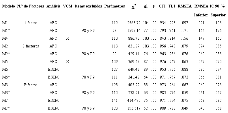 En todos los modelos analizados, los índices de modificación evidenciaron dos pares de ítems con redundancias excesivas (i.e., redacción equivalente) en cada uno de los factores, específicamente: P7 (Los grupos inferiores deberían mateerse en su lugar) con P8 (La diferencia entre grupos sociales es natural y debería ser mateida); y P9 (Sería deseable que todos los grupos fueran iguales) con P10 (La igualdad entre los grupos debería ser nuestro ideal). Por lo tanto, se hicieron nuevos análisis de cada modelo (M1, M2, M3, M6 y M7), realizando depuraciones iterativas y descartando los ítems que presentaron constantemente saturaciones más bajas (P8 y P9).