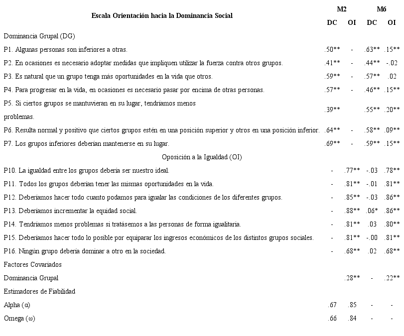 Finalmente, con respecto a las estimaciones de fiabilidad de la escala SDO con 14 ítems, DG obtuvo coeficientes α =.67 y ω=.66, mientras que oí obtuvo coeficientes α=.85 y ω =.84. Asimismo, cada dimensión presentó correlaciones ítem-total superiores α .31 (DG=.31 a .41; 01=45 a .70).