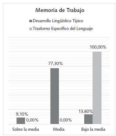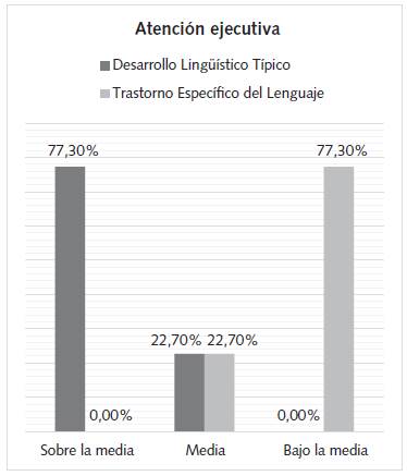 En lo referente a la atención ejecutiva, el porcentaje de participantes con TEL que puntúan bajo la media es de un 77.3 %, lo que, unido a las bajas puntuaciones en MT, podría constituir un factor relevante en la explicación de las alteraciones expresivas que presentan estos niños, y que en un contexto cotidiano se aprecian en una escasa atingencia al contexto y en la continua interrupción en el proceso comunicativo. Estas características vienen a corroborar que, mientras menor sea la habilidad atencional, menor será también la capacidad que los niños poseen para almacenar la información con la que deben operar en el contexto comunicativo (Marton, 2008).