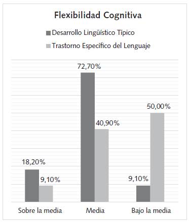 En menor medida, pero con un significativo 50 % de rendimiento bajo la media para los participantes con TEL, en contraste con el 9.1 % de los que presentaban DLT, está la flexibilidad cognitiva. Estos resultados están en consonancia con los obtenidos por Henry et al. (2012), quienes establecen que en flexibilidad cognitiva se observan las menores diferenciaciones entre ambos grupos. No obstante, este alto porcentaje podría explicar la naturaleza de la perseverancia en los errores cometidos por estos niños y su déficit en la capacidad de replantear nuevas estrategias comunicativas.