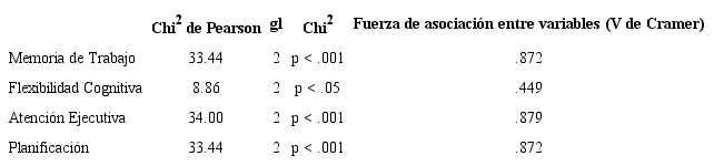 Con base en el análisis de significación mediante la prueba Chi2, los resultados obtenidos mostraron que el rendimiento en las FE de MT, atención ejecutiva y planificación estarían relacionados con el diagnóstico de TEL, estableciendo una relación de dependencia, al menos en el 99% de los casos. Para la flexibilidad cognitiva también se obtuvieron resultados significativos, aunque la probabilidad disminuye al 95 %, como se observa en la Tabla 1. Los resultados de la prueba V de Cramer para medir la fuerza de asociación entre las variables, corroboran los resultados mencionados anteriormente, estableciendo que la MT, la atención ejecutiva y la planificación sostienen una fuerte asociación con el diagnóstico lingüístico.