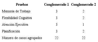 Luego se procedió a realizar análisis de conglomerados de K medias, con el objetivo de evidenciar las diferencias entre los casos, agrupándolos en clusters que responden a patrones de respuesta similares. Para ello, a raíz de las puntuaciones obtenidas en los distintos subtests de evaluación de las FE, se ha asignado un valor a cada una de las tres categorías establecidas anteriormente, utilizando este valor posteriormente como criterio para la configuración de estos clusters. Los resultados de estos análisis (Tabla 2) evidencian la existencia de 2 grupos bien diferenciados, alcanzando la máxima distancia entre los centros de estos conglomerados después de 3 iteraciones. De esta forma, a partir de los datos obtenidos se pueden establecer dos perfiles: uno caracterizado por puntuaciones que se encuentran en la media o sobre la media en las cuatro variables estudiadas, encontrándose en este grupo la totalidad de los estudiantes con DLT; y otro grupo caracterizado por la obtención de puntuaciones que se encuentran por debajo del promedio en las cuatro pruebas evaluadas, encontrándose en este grupo el total de estudiantes que presentan TEL.