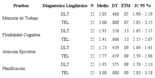 Los resultados de las pruebas realizadas establecen que los estudiantes con DLT superan en todas las FE evaluadas a los estudiantes con tel. Las mayores diferencias se produjeron entre ambos grupos de estudio en MT y planificación, donde el 100 % de los participantes con TEL se situó con un rendimiento bajo la media, en tanto el 86.4 % de los que presentaban DLT se situó en o sobre la media. Esta información confirma los datos obtenidos por Henry et al. (2012), quienes establecen que MT y planificación estarían entre las fe que más diferenciación generan entre ambos grupos de estudio, siendo superadas solamente por las habilidades de fluencia verbal. Así mismo, es concordante con lo establecido en el estudio de Buiza-Navarrete et al. (2007), en el que plantean que los niños con TEL mostrarían notorias dificultades en su capacidad para planificar y ejecutar tareas. De este modo, el resultado obtenido podría explicar en cierta medida las dificultades que se aprecian en los niños con TEL, en relación con la elaboración de enunciados. Los resultados obtenidos en el estudio de González (2019) revelan datos similares en cuanto a planificación y TEL, evidenciando nuevamente mejores resultados en estudiantes con DLT cuando se enfrentan a tareas en las que debían planificar acciones y ejecutarlas. Estos resultados, además, inciden en la interrelación entre distintas FE, y en la relevancia de tomar esto en consideración a la hora de plantear el desarrollo de modelos y propuestas de intervención.
