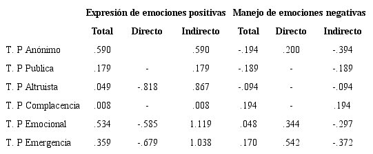 La Tabla 7 muestra los efectos totales, directos e indirectos de las variables expresión de emociones positivas y manejo de emociones negativas sobre las variables de respuesta. El efecto total más importante logrado por la variable expresión de emociones positivas es sobre la tendencia prosocial anónima (.590), seguido por el efecto sobre la tendencia prosocial emocional (.534). El menor efecto total es sobre la variable complacencia (.008). Para el caso de la variable predictora manejo de emociones negativas, el efecto total más importante se da sobre la tendencia prosocial por complacencia (.194), seguido por la tendencia prosocial emergencia (.170). El efecto más pequeño, en valor absoluto, fue sobre la tendencia prosocial emocional (.048).