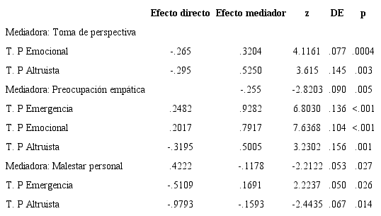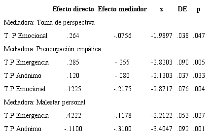 Por otro lado, considerando la variable manejo de emociones negativas, se obtiene la cadena causal manejo de emociones negativas y tendencia prosocial emocional, mediada por toma de perspectiva. Se tienen también las cadenas causales manejo de emociones negativas y emergencia, anónimo y emocional, medidas por preocupación empática. Finalmente, las cadenas causales manejo de emociones negativas con emergencia y anónimo, mediadas por malestar personal. La Tabla 9 muestra los efectos directos, mediadores y los estadísticos del test de Sobel para evaluar la significancia de los efectos mediadores. Todos los efectos de mediación resultan ser estadísticamente significativos y la relación de mediación es nuevamente parcial (Holmbeck, 2002).