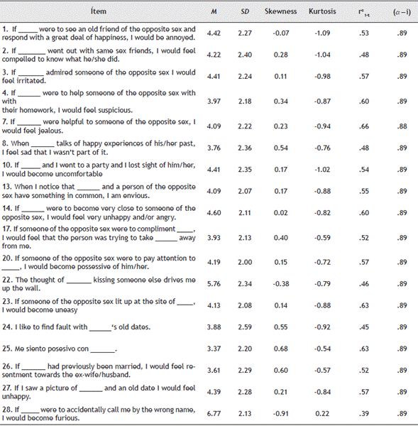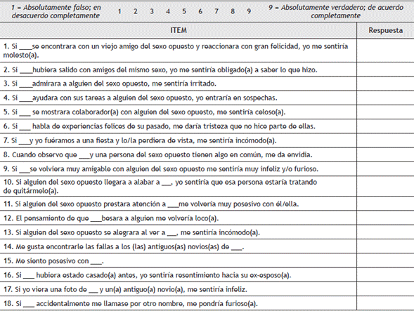 It is also noteworthy that some of the items deleted, such as item 5 "When___likes some of my friends, I am pleased" and item 11 "I want____to continue to maintain the friendship with the people with whom he used to go out" alluded to the subject of friendship, which is probably not generating romantic jealousy, unlike questions that indicate communication with ex-partners (Knox, Zusman, Mabon, & Shriver, 1999). Items such as 12 and 15, which had no negative syntax but which included very general statements such as "I would like____to be faithful to me", to which most people responded positively, failed to discriminate the construct being measured. Thus, the IJS, composed of its 18 items, evaluates jealousy in a single dimension understood as sensitivity to the threats of the rival a concept according to the essence of the construct (Salovey, 1991).