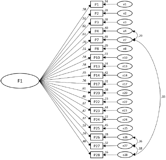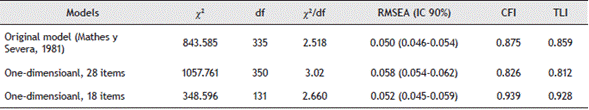 CFA was performed in order to establish construct validity. First, the six-factor model proposed by Mathes and Severa (1981) was tested, but some indicators were not adequate. We then tested a unidimensional model including all the items, which also did not show a good fit. Therefore, the IRT analysis for the 28 items was performed, evaluating the Infit and Outfit parameters, which indicated that the items 5, 6, 9, 11, 15 y 16 do not conform to the model, since their Outfit values (1.56, 1.62, 1.45, 1.55, 2.36 y 1.87) were outside the accepted range (Bond & Fox, 2007). Subsequently, corrected item-test correlations were performed. The previous six items, together with items 12, 18, 19 and 21, obtained the lowest correlations with values under .20. Taking into account the analyses above, these ten items were debugged. Table 1 presents the indices of goodness of fit of each model. The one-dimensional model with 18 items showed an adequate fit (see Appendix).