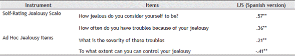 As to external evidence of validity, positive and significant relationships were found - as expected - which support the relationships already demonstrated by Mathes (1992). The correlation of the results of the total score of the IJS with the Self-Rating Jealousy Scale was equally significant, as in the case of the evidence obtained by Hawkins (1987). The relationship between the score of the IJS and the number and severity of arguments due to jealousy - and the control the person has over their jealousy - are consistent with the indications given by Dutton, Ginkel and Landolt (1996). The latter demonstrated a significant relationship between the IJS and self -reported scores of anger. All the evidence above supports the findings of DeSteno, Valdesolo & Barlett (2006), who reported a relationship between jealousy and aggressive behavior. However, it is advisable to make comparisons with a similar instrument so as to ensure concurrent validity and determine overall construct validity (Messick, 1994). These studies will allot to reject or confirm the common variation of the items that make up the test with stronger supporting foundations.