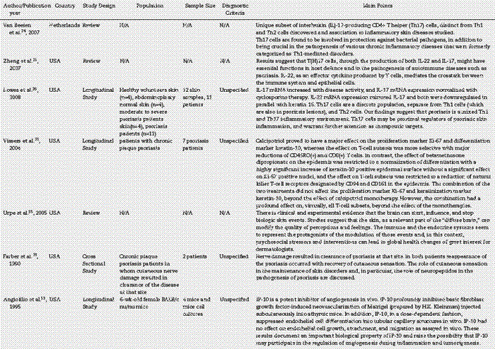 The term "diffuse brain35) " has often been used to describe the highly innervated skin coining its strong relation to psychoneurological factors. The skin is known to contain a wide variety of neuropeptides including calcitonin gene-related peptide (CGRP), vasoactive intestinal peptide (VIP), nerve growth factor (NGF), substance P, and catecholamines, and studies have found a correlation between autonomic nervous system and respective neuropeptide activation with psoriasis. (36,37) In fact, in patients with severance of sensory innervation due to trauma in specific areas, psoriatic plaques in those areas receded, coming back after nerve healing had occurred.38) This finding supports the idea that neuropeptides and brain activity relating to the release of said peptides may factor into the longevity of psoriasis or even its onset.38,39) Psoriatic plaques have also been found to have increased nerve fiber density and abnormal expression of various neuropeptides, (39,42) and this finding is substantiated due to the fact that increased concentration of NGF and other neuropeptides mediate T cell and keratinocyte proliferation, memory T cell chemotaxis, mast cell migration, and degranulation, all processes known to be related to psoriatic lesions. (43,44) Additionally, blood brain-derived neurotropic factor (BDNF) is found to be significantly reduced in psoriatic and depressive patients. (45) As such, it can be said that the inflammation pathway that includes TNF-a, IFN--y, and other type-1 cytokines strongly delineates the mechanism underlying psoriasis, (21) however certain other forces may be at play and this mechanism may not just be limited to local skin areas. Furthermore, IL-17 has also been considered relevant with respect to psoriasis pathophysiology. (46,48