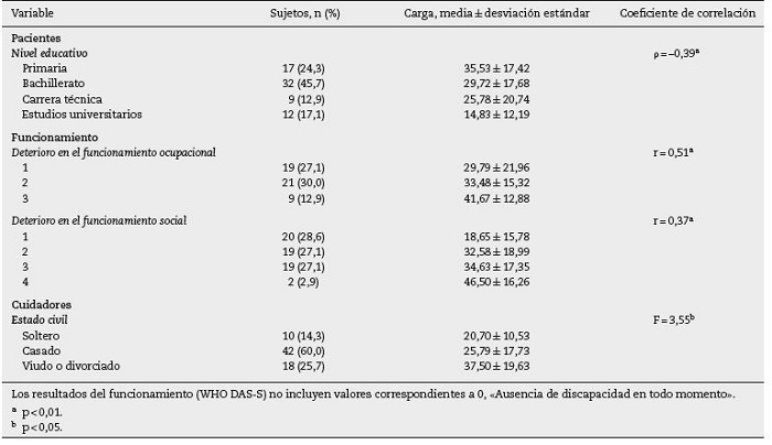 En cuanto a los cuidadores, se observó un predominio de mujeres, en su mayoría madres (74%), con una media de edad de 60,1 ± 9,20 años, casados (60%), con estudios universitarios finalizados (34,3%), empleados (50%), que reportaron7homás de contacto diario con el paciente (58,6%). En este estudio, los cuidadores presentaron una puntuación media en carga de 28,07 ± 18,18. La tabla 1 presenta las correlaciones significativas que se hallaron entre las características demográficas de demográficas y las variables clínicas de los pacientes y la carga los cuidadores, las características demográficas y las variables clínicas de los pacientes y la carga.