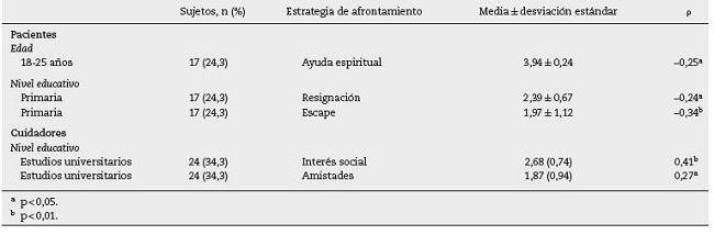 Respecto a las variables demográficas, se encontraron diferencias significativas en el uso de la información como estrategia de afrontamiento (U = 206,5; p < 0,05) de acuerdo con la ocupación del cuidador; se observa que los cuidadores en situación de desempleo adoptaron esta estrategia con más frecuencia (2,34 ± 0,98). La tabla 2 presenta las correlaciones significativas halladas entre otras características demográficas de los cuidadores y los pacientes y las estrategias de afrontamiento. El incremento en la puntuación (1-4) indica mayor frecuencia de uso de la estrategia de afrontamiento.