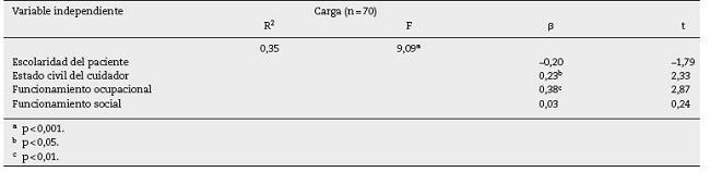 Se realizó un análisis de regresión múltiple usando las variables que se correlacionaron significativamente con la carga del cuidado. Los resultados del análisis de regresión se presentan en la tabla 3. El modelo de regresión explicó el 35% de la varianza de la carga. Las puntuaciones t indicaron que las variables deterioro del funcionamiento ocupacional del paciente (t=2,87; p<0,01) y estado civil del cuidador (t=2,33; p < 0,05) aportaron significativamente al modelo de predicción.