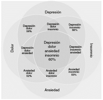 El conjunto de síntomas de la depresión agrava y acentúa los síntomas dolorosos y, viceversa, una potenciación similar se da con el insomnio y las manifestaciones de ansiedad. La relación entre dolor, alteraciones del sueño y quejas cognitivas establecen un síndrome similar a la depresión que hace difícil discernir los diferentes componentes psicopatológicos117,118. Todas estas circunstancias hacen compleja la intervención terapéutica y con frecuencia la eficacia de los medicamentos no es la adecuada para una sola manifestación, dado el solapamiento que presentan. El conocimiento de la comorbilidad depresión-ansiedad-dolor crónico-insomnio es fundamental en la búsqueda de intervenciones terapéuticas eficaces y asertivas.