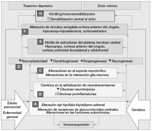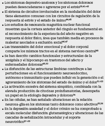 Los avances en la investigación biomédica de años recientes indican que los trastornos depresivos y ansiosos comparten aspectos biológicos y ambientales con los trastornos dolorosos crónicos y el insomnio. Entre los factores biológicos, se han encontrado determinantes genéticos que incluyen genes que regulan la señalización de neurotransmisores y citocinas neurotróficas e inflamatorias. Entre los factores ambientales de riesgo, se encuentran el estrés psicosocial, especialmente cuando es continuo, y la enfermedad en general, los cuales promueven, en individuos vulnerables, cambios en la sensibilidad de los receptores de glucocorticoides en el sistema nervioso y otros órganos, disfunción del eje hipotálamo-hipófiso-adrenal, alteraciones en las funciones autonómicas y aumento en la producción y la liberación de citocinas proinflamatorias; todo lo cual confluye en variaciones estructurales y funcionales del sistema nervioso (tabla 2). La vía fisiopatológica común tiene que ver con alteraciones en el soporte neurotrófico y de la interacción glianeurona, que ocasionan un fenómeno de sensibilización central al dolor, asociada por la misma vía a las manifestaciones depresivas y ansiosas y las alteraciones del sueño. La concomitancia de los 4 componentes clínicos adquiere un carácter biológico sinérgico que se asocia a la naturaleza progresiva y la tendencia a la perpetuación de estos trastornos, especialmente cuando no se tratan adecuadamente.