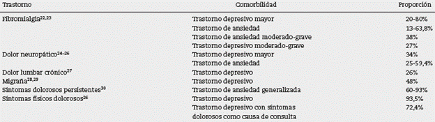 Un análisis de un modelo bidimensional de ansiedad y depresión encontró que las puntuaciones de cada uno de estos síndromes se correlacionaban significativamente con la intensidad y la gravedad del dolor11,12. Por otro lado, un estudio epidemiológico mostró que los síntomas físicos dolorosos son una característica común en los pacientes que sufren trastorno de ansiedad generalizada y en mayor magnitud en los pacientes con trastorno depresivo comórbido. Se ha demostrado asociación entre síntomas físicos dolorosos en pacientes con trastorno de ansiedad con o sin comorbilidad depresiva y deterioro funcional en el trabajo, los aspectos sociales y el funcionamiento familiar11.