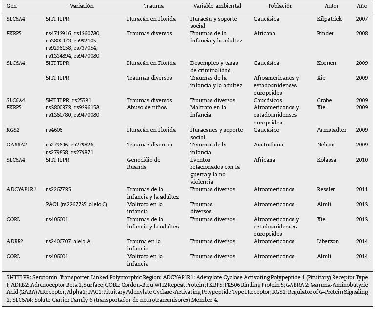 Otro estudio que encuentra asociación positiva entre un gen y el ambiente propicio a los eventos traumáticos es el realizado por Kolassa et al. en pacientes refugiados del genocidio en Ruanda, que analizó a 408 sujetos (218 varones y 190 mujeres) que vivían refugiados en un campo en el suroeste de Uganda. Todos los sujetos habían vivido múltiples situaciones traumáticas. Los resultados de este trabajo reportaron que el gen SLC6A4 que codifica el gen transportador de 5-hidroxitriptamina, implicado en estudios anteriores de depresión y respuesta a medicamentos38, confiere un riesgo de asociación a sufrir TEPT después de eventos traumáticos39. Otros estudios han asociado diferentes genes y polimorfismos vinculados a variables ambientales (tabla 1).