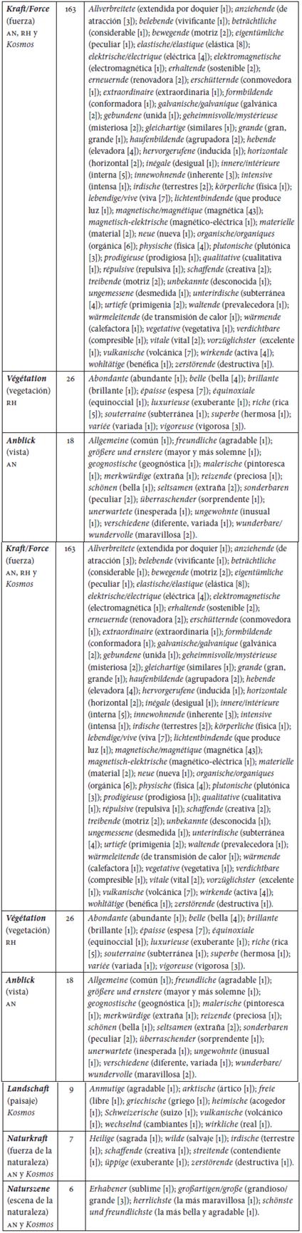 Esos tres sustantivos son lógicamente inevitables en la narrativa naturalista. Pero Humboldt también se sirve de sustantivos menos imprescindibles. Por esta razón he rastreado también sustantivos como "vista", "paisaje" y "escena de la naturaleza". Sus respectivos significados reciben en la prosa de Humboldt una adjetivación representativa de una visión más subjetiva de la naturaleza. Cuando esto ocurre, obviamente, Humboldt se sirve de un léxico más propio de descripciones románticas de la naturaleza: vista agradable, solemne, preciosa, bella, sorprendente, maravillosa, paisaje agradable, acogedor; fuerza de la naturaleza sagrada, creativa, exuberante, destructiva; escena de la naturaleza sublime, grande, maravillosa, bella, agradable. Este léxico, sin embargo, no excluye la presencia, en compañía de los mismos sustantivos, de adjetivos más apropiados o próximos al campo semántico de la narrativa científica: vista geognóstica, paisaje volcánico, fuerza terrestre de la naturaleza, etc.
