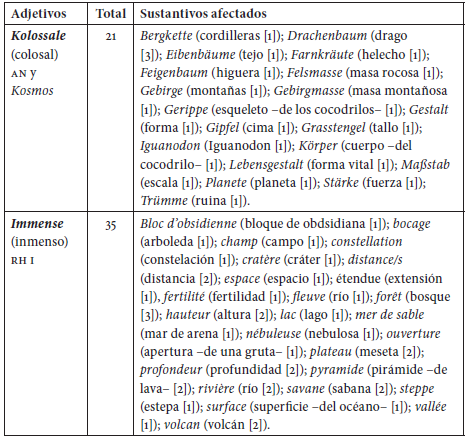 La tabla 1 muestra la presencia de numerosos adjetivos referentes a una valoración estética de la naturaleza, así como a la impresión de Humboldt frente a la riqueza, exuberancia y belleza de la naturaleza. A este respecto, conviene realizar un rastreo del léxico humboldtiano de forma inversa a la que ya se ha puesto en práctica en la tabla 1. Esta vez se analizará la frecuencia de una serie de adjetivos filorrománticos en la percepción de la naturaleza en Humboldt. Para ello, se ha hecho un rastreo de todos los sustantivos directa o indirectamente referentes a la naturaleza que sean afectados por los adjetivos kolossale (colosal) en AN y Kosmos, e inmense (inmenso) en RH.7 La cantidad de sustantivos a los que afecta ofrece un muestrario léxico suficientemente amplio como para mostrar una perspectiva detallada sobre la forma humboldtiana de aproximación a la naturaleza: