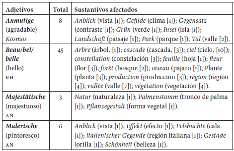 Un análisis más amplio de adjetivos dedicados a la descripción paisajística permitirá ver de forma más exhaustiva el campo expresivo que abarca el uso de un vocabulario más descriptivo y menos positivista. Para ello, se ha realizado rastreo de adjetivos de carácter filorromántico como anmutige (agradable), beau/bel/belle (bello), majestatische (majestuoso) y malerische (pintoresco), aplicados a elementos de la naturaleza presentes en AN, RH y Kosmos. Esta selección de adjetivos se ha realizado en función de su presencia en la tabla 1, dado que constituyen algunos de los más relevantes para un estudio centrado en la percepción y descripción de la naturaleza en la obra de Humboldt: