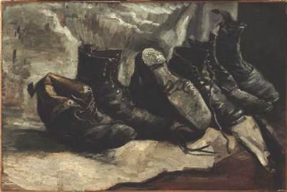 A partir de sus comienzos, el arte se ha ocupado de representar zapatos y los ha vinculado con diferentes sucesos. Como acompañantes de gestas notables, sucesos ilustres, dramáticos acontecimientos o tiernos episodios. Sin embargo, hay un artista en particular que hizo de los zapatos un elemento protagónico y recurrente en sus obras. Vincent Van Gogh pintó cerca de una decena de cuadros con zapatos como "tema", y muchos otros utilizándolos como modelo secundario.1 En El origen de la obra de arte (1952), Martin Heidegger indaga y explica la esencia de la obra artística. En esta obra, Heidegger le dará capital importancia a un particular cuadro de zapatos del artista holandés, que el filósofo alemán titulará Zapatos de campesina o Zapatos de campesino (1886).2