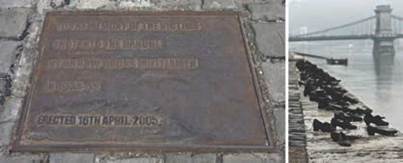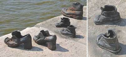 Zapatos a orillas del Danubio (2005) es una obra creada por los artistas Can Togay y Gyula Pauer en la orilla del río Danubio, en Budapest, Hungría (figuras 3 y 4), para recordar los brutales asesinatos que tuvieron lugar en la ciudad durante la Segunda Guerra Mundial. Con este propósito y al conmemorarse sesenta años de los dramáticos sucesos, se montó una instalación artística, un grupo escultórico, al borde del río, donde una hilera de sesenta zapatos pareciera aguardar a sus propietarios a que salieran del baño en el río. Togay y Pauer crearon estos sesenta pares de zapatos en hierro, recreando los diseños de la época. Los zapatos están adosados al paseo peatonal de piedra, donde hay tres planchas de hierro escritas en húngaro, inglés y hebreo, con el siguiente texto: "a la memoria de las víctimas asesinadas y arrojadas al Danubio por las milicias del partido nazi húngaro en 1944-1945. Erigido el 16 de abril del 2005" (figura 3).
