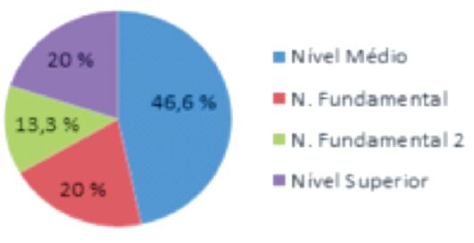 O questionário foi aplicado em 30 usuários com deficiência visual. Desse contingente, foram entrevistados 15 homens e 15 mulheres. Vinte por cento das mulheres entrevistadas têm nível superior de ensino completo ou estão cursando (Figura 1), e dentre os entrevistados, apenas as mulheres possuem esse nível de escolaridade (Figura 2). A maior parte dos entrevistados, 60%, possui apenas o nível médio.