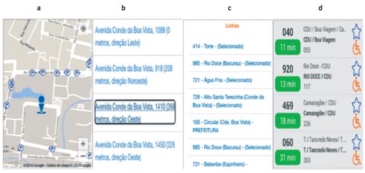Os atributos do modelo estão descritos nas Tabelas 4 e 5. Esses atributos concentraram as principais funcionalidades necessárias para o desenvolvimento do protótipo com interface para seleção (Figura 4). A interface oriunda dos atributos ilustrados na Figura 3, divide-se em quatro etapas: localização, ponto, linha e chegada. A Figura 4(a) propõe que o usuário tenha sua localização GPS (Global Positioning System) transformada em um ponto no mapa, para que o mesmo possa escolher pontos próximos a sua localização, os quais são demonstrados na Figura 4(b). Após a escolha do ponto, o usuário é direcionado, via a verbalização do dispositivo móvel, para a seleção das linhas que passam nesse ponto Figura 4(c). Na última etapa, Figura 4(d), o usuário tem como resultado uma lista com a relação das linhas selecionadas na etapa anterior com a informação do tempo aproximado de chegada até a localização informada para o usuário. Ressalta-se que todas as etapas utilizam a verbalização (leitores de tela) do dispositivo móvel.