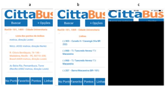 Outro problema encontrado foi a apresentação de alguns pontos, que mostrava o código postal em sua descrição. Esses fatos, apresentados pelos avaliadores (usuários com deficiência visual) foram analisados como confusos. Na segunda etapa, Figura 5(b), foi identificado um erro quando o ponto selecionado apresentava mais que cinco ônibus em sua lista, nesse caso, o CittaBus, gerava uma interface com a cor preta e o leitor de tela parava de responder aos comandos do usuário, Figura 5(c). Após as avaliações iniciais, a empresa