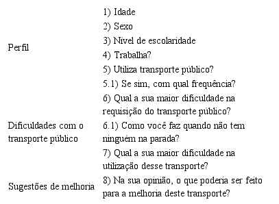 O questionário (Tabela 1) foi aplicado com o objetivo de verificar a hipótese inicial dessa pesquisa: a existência da dificuldade de acessibilidade aos ônibus pelos usuários com deficiência visual. Para isso, o questionário foi dividido em três grupos de perguntas: (i) perfil socioeconômico, com proposito de melhor identificação do perfil dos usuários com deficiência visual; (ii) dificuldades com o transporte público, para a identificação das principais dificuldades dos usuários na utilização do ônibus; e, (iii) sugestões de melhoria, para o mapeamento das sugestões de melhorias para o transporte rodoviário. O segundo grupo de perguntas foi elaborado para possibilitar aos usuários explicar as dificuldades encontradas em três situações básicas: (i) solicitar um ônibus; (ii) solicitar um ônibus sozinho em um ponto de parada para ônibus; e, (iii) após o embarque, quais as maiores dificuldades no uso deste meio de transporte. O questionário foi elaborado de maneira que o usuário pudesse expressar livremente as suas opiniões, para posterior mapeamento e identificação dos pontos convergentes entre as diversas opiniões coletadas.
