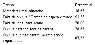 Sessenta por cento dos entrevistados estão entre 28 e 41 anos de idade e que todos utilizam o transporte público como meio de transporte diário para as suas atividades, precisando, por vezes, utilizar mais de um ônibus ou mais de um meio de transporte para chegar e retornar do seu destino. Dentre as respostas dos usuários foi possível verificar que existem queixas frequentes de ambos os sexos sejam por segmentação de idade ou grau de escolaridade.