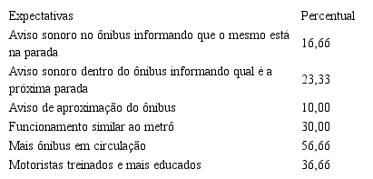 A análise dos dados coletados por meio dos questionários permitiu identificar três grupos de opiniões a respeito do serviço de ônibus: as impressões, expectativas e as sugestões de melhoria para este serviço. Na percepção dos entrevistados, a respeito do funcionamento do serviço de transportes estão relacionadas propriamente ao serviço e não a dificuldade de acesso ou uso. O item apontado por 63,33% dos entrevistados mostrado na Tabela 2ressalta o fato dos ônibus não pararem mesmo sendo requisitados. Os entrevistados alegam que os motoristas “passam direto no ponto” quando visualizam que apenas usuários com deficiência visual estão no ponto de ônibus. Essa atitude é uma questão cultural na má prestação do serviço de transporte e não deve ser relacionada como direcionada á um perfil específico de usuários, mesmo que está seja a percepção dos usuários entrevistados, visto que existem relatos dos mais diversos perfis de usuários alegando que a falta de fiscalização possibilita a falta de comprometimento das prestadoras com a população.