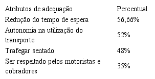 A análise das respostas dos entrevistados possibilitou a percepção de que os mesmos conseguiram, apesar dos impedimentos estruturais, se adaptarem a realidade imposta utilizando o sistema de ônibus em seu dia a dia. A maioria dos entrevistados relacionaram as necessidades de adequação do sistema de transporte com o tempo de espera, autonomia na utilização do sistema, local para sentar dentro dos coletivos, etc (Quadro 1). Estas queixas não são exclusivas dos usuários com deficiência visual, fato que revela que além dos problemas estruturais que geram dificuldades particulares a sua deficiência, os mesmos enfrentam toda problemática comum aos outros usuários. Observa-se que 56,66% dos usuários revelaram que a redução do tempo de espera é a adequação do serviço de ônibus que mais desejam, ainda assim, 52% desejam ter a autonomia na utilização desse serviço (Quadro 1). Dessa forma, não desejam depender da ajuda de terceiros para conseguir utilizar o seu meio de transporte diário. Pode-se observar que além da autonomia propiciar um direito ao exercício de sua cidadania, 35% esperam ser respeitados pelos motoristas e cobradores, fato que retoma a perspectiva que os problemas relacionados ao sistema de transporte estão longe de ser apenas um problema de mobilidade ou de infraestrutura das cidades, mas sim um problema social.