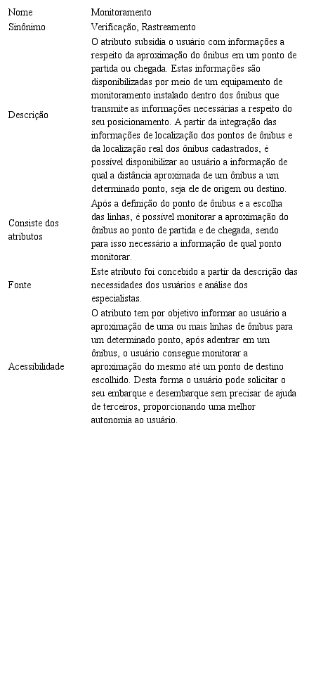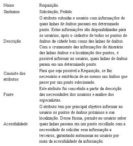 A partir do modelo baseado em atributos proposto por (Kang et al. 1998), como parte do método Feature-Oriented Domain Analysis, foram identificados os atributos requisição e monitoramento, aderentes às necessidades apresentadas pelos usuários com deficiência visual entrevistados na estapa anterior. De acordo com o método, cada atributo do modelo deve ser descrito (Quadro 2).