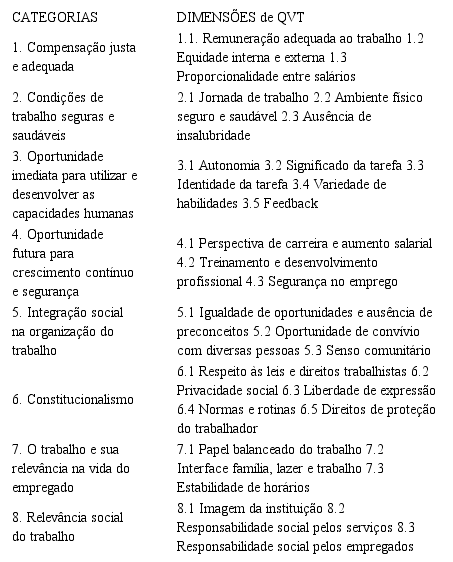 A partir das amplas abordagens sobre o tema, construiu-se um guarda-chuva teórico que envolve três núcleos: o humanismo (que tem alternância entre motivação e satisfação), a participação do empregado em decisões de gestão e o bem-estar (Sampaio, 2012). Embora o interesse da academia pela QVT tenha surgido na década de 1950 (Tolfo & Piccinini, 2001), ao longo de mais de 40 anos, surgiram diversos conceitos e instrumentos de mensuração da Qualidade de Vida no Trabalho (QVT). Atualmente, a QVT define-se como a percepção mental dos funcionários da conveniência física e psicológica do local de trabalho e está relacionada com o bem-estar dos empregados no trabalho (Kanten & Sadullah, 2012). Dentre os modelos mais consagrados nas ciências administrativas sobre a QVT, destacam-se os de Walton (1973) e na perspectiva brasileira os de Oliveira & Limongi-França (2005) e de Pedroso, Pilatti, Gutierrez e Picinin (2014). Esses modelos agrupam variáveis de natureza física, psicológica, social e organizacional. Dentre os fatores que podem influenciar a percepção dos trabalhadores sobre a Qualidade de vida no Trabalho destacam-se a remuneração, a jornada de trabalho e o cumprimento das leis trabalhistas pelos empregadores (Paiva & Avelar, 2011).