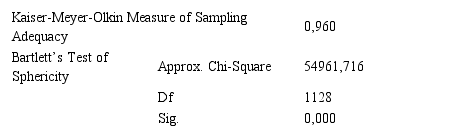 Antes de aplicada a análise fatorial exploratória (AFE) seus pré-requisitos de utilidade foram verificados. Todas as correlações entre as variáveis apresentaram significância estatística (0,000) com maioria indicando valores altos e positivos. Além disso, a matriz anti-imagem apresentou apenas valores superiores a 0,9, refletindo elevado poder de explicação dos fatores em cada uma das variáveis. O teste de Kaiser-Meyer-Olkin prestou valor superior a 0,7 (recomendando) e o teste de esfericidade de Bartlett, que demonstra se há relação suficiente entre os indicadores para a aplicação da análise fatorial – o que é indicado pela rejeição da hipótese nula que as correlações entre as variáveis sejam nulas – apresentou significância estatística conforme visto na Tabela 1.