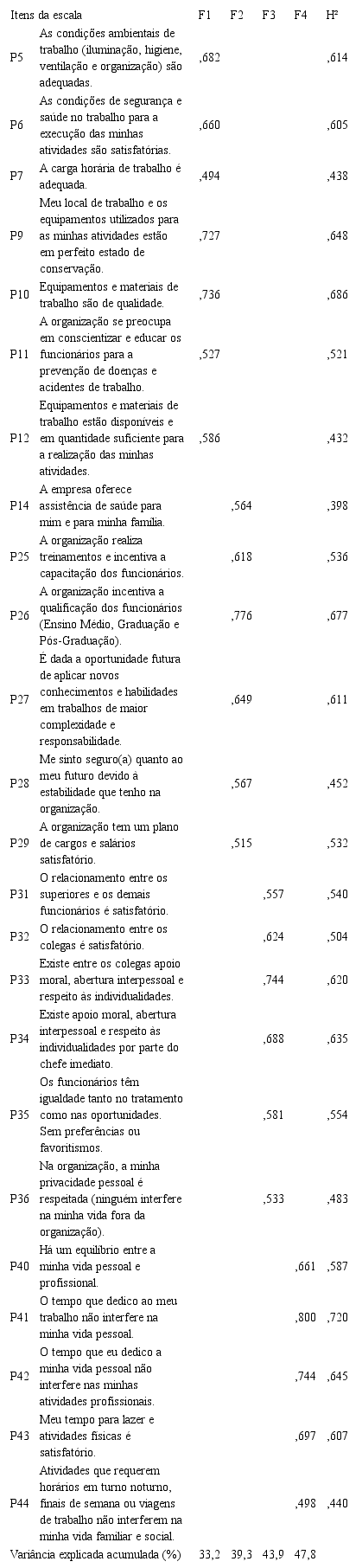 A escala original foi validada aplicando-se o questionário para uma amostra de 120 indivíduos, com 48 variáveis e AFE indicando 6 fatores como solução final adotada que explicava 77,2% da variância da escala total (Maia, Araújo & Alloufa, 2012). Conforme recomendações, a análise fatorial deve ser utilizada com, pelo menos, dez observações para variável. Neste estudo, esta recomendação é obedecida e a análise fatorial aplicada, respeitando os seus pressupostos, identificando 8 fatores como solução escolhida, com 60,4% da variância total explicada, – dimensões equivalentes àquela proposta por Walton (1973) – bem como ampliando o escopo de aplicabilidade da escala, trazendo-a ao contexto do setor privado. Este resultado atende ao objetivo do estudo. Os fatores foram nomeados em equivalência à nomenclatura já apresentada no quadro teórico inspirado no trabalho de Walton (1973) e são discutidos a seguir.