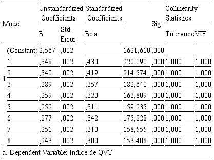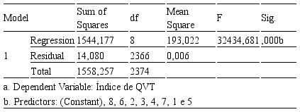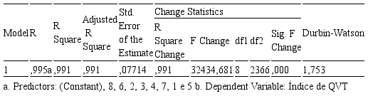 Depois de identificadas as dimensões reduzidas a partir das variáveis da escala de qualidade de vida no trabalho (QVT), atendendo à questão de pesquisa proposta, os fatores identificados foram utilizados como variáveis independentes numa análise de regressão que tinha variável dependente um índice geral de QVT calculado a partir da média aritmética da soma dos valores de cada uma das 48 variáveis. Os resultados deste teste de regressão são apresentados a seguir nas tabelas 4, 5 e 6.