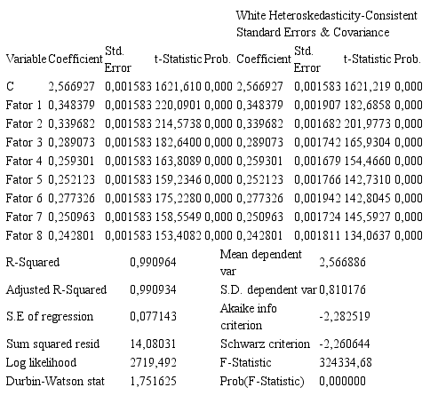 O Teste Pesarán-Pesarán, para este trabalho, rejeitou a hipótese nula de que os resíduos são homoscedásticos (Sig. < 0,01), apresentando indícios de heteroscedasticidade. Com isso, procedeu-se com a correção de heteroscedasticidade de White (homogeneização de variâncias), com apoio do software de análise estatística E-Views 5.0®, cujos resultados são apresentados na Tabela 8. Como é possível visualizar, a coluna de erros padronizados tem seus valores aumentados após a correção, aliada à redução dos valores do “t-statistic”. De acordo com Corrar et al. (2014), observando-se que os coeficientes do modelo de regressão permanecem os mesmos e estatisticamente significantes após aplicada a correção, implica em dizer que estes podem ser usados para inferência estatística sem riscos de erros na decisão.