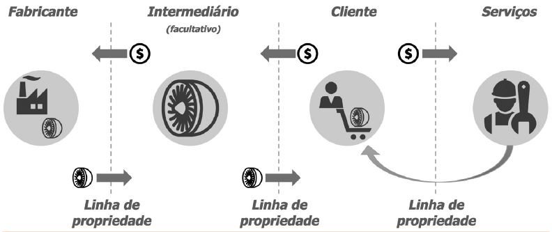 Dois modelos foram criados na tentativa de representar o papel de indústrias na cadeia de valor: Um no contexto tradicional (Figura 1) e outro no contexto da servitização (Figura 2). Na Figura 1, o fabricante produz seu produto e o vende para um intermediário, sendo a propriedade do produto transferida do fabricante para o intermediário, o qual, por sua vez, repassa para seu cliente. No entanto, o papel do intermediário pode não existir, ocorrendo, assim, uma transação entre o fabricante e o cliente diretamente. Nas duas situações o cliente passa então a ter posse do produto e faz uso do mesmo, sendo de sua responsabilidade procurar terceiros para suprir eventuais necessidades que o produto venha a ter após a aquisição (e.g. manutenção). Assim, tem-se o capital caminhando do cliente em direção ao fabricante, e o produto caminhando no sentido inverso. No caso da prestação de serviços, o terceiro faz seu trabalho mediante um pagamento.